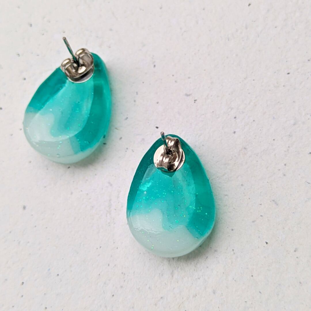 透明感のあるグリーンのレジンに、シルバー箔を閉じ込めた雫型のピアス